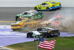 Former race winners Ricky Stenhouse Jr. and Joey Logano finished second and third as Toyota, Chevrolet and Ford each placed a driver on the podium. Elliott wound up fourth and sat dejected and in disbelief on the outside wall of the track after climbing from his car.