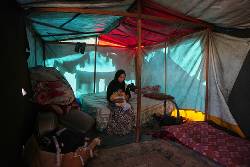 Mothers battled the damp, slinging clothing over poles or cord to dry in the wind between the downpours that turn paths into puddles. One mother pulled a tiny child away from a mildewing patch of carpet.