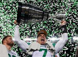 Trevor Harris completed 23 of 27 passes for 302 yards for Saskatchewan, and the 39-year-old was selected the game MVP.