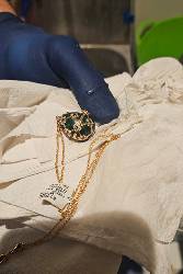A less glamorous photo supplied by New Zealand's police Friday showed a gloved hand holding the recovered pendant, which was still attached to a long, gold chain with an intact price tag. A spokesperson said the necklace and the man would remain in police custody.