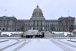 With plowable snow expected to coat large parts of Pennsylvania, crews began to treat lanes along the 565-mile (909-kilometer) Pennsylvania Turnpike system on Monday, said the agency’s press secretary, Marissa Orbanek. Vehicle restrictions on many interstates in the eastern half of Pennsylvania, including on the turnpike system’s Northeast Extension, from the Lehigh Valley to Clarks Summit, were imposed at 5 a.m. Tuesday.