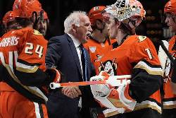 Quenneville's Ducks got his win in dramatic fashion: Anaheim erased a pair of two-goal deficits and another third-period deficit before Cutter Gauthier scored the tiebreaking goal with 1:14 left. When the clock ran out, Quenneville high-five each of his players at the bench before taking the ice to pose for a team photo.