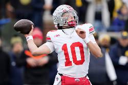 Sayin helped the Buckeyes pull away with a perfect pass to Carnell Tate for a 50-yard touchdown in the third quarter, lofting a ball over the receiver's shoulder after he got past Michigan’s secondary.