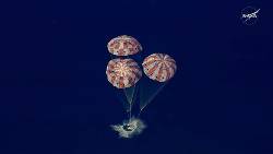 The astronauts’ families huddled in Mission Control’s viewing room, where cheers erupted when the capsule emerged from its communication blackout and again at splashdown.
