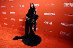 Raven Johnson debuted a bob hairdo on the orange carpet — a big change from the long hair the South Carolina guard had in a ponytail at the Final Four only a week ago. Johnson said she partnered with Coach going for a rich and elegant look in a gray and black jacket-style dress with black clutch, diamond necklace and earrings.