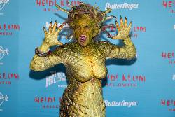 NEW YORK (AP) — Heidi Klum donned green scales and squirming snakes to transform herself into Medusa for Halloween on Friday.