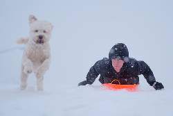 As snow came down steadily throughout the day, some people went out sledding with their families and dogs. Others stayed cozy at home to avoid treacherous traveling conditions.