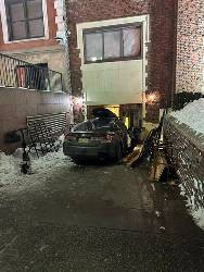 Video of the crash that was posted online shows a car with New Jersey license plates moving forward and backward on an icy driveway leading to a building in the complex and ramming its basement-level doors.