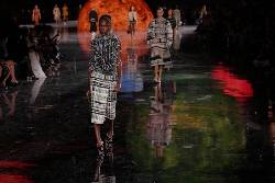 Reflections mirrored the cosmos beneath the runway, while a front row constellation — Nicole Kidman, Marion Cotillard, Tilda Swinton, joined by Lauren Sanchez and Jeff Bezos — gazed upward.