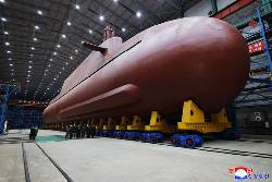 The agency did not specify when Kim visited the shipyard but released photos showing him inspecting a huge, burgundy-colored vessel, coated with what appears to be anti-corrosion paint, under construction inside an assembly hall with senior officials and his daughter. It was the first time North Korean state media had released images of the submarine since March, when they mostly showed the lower sections of the vessel.
