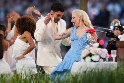 The scene shifted to a wedding, where the seemingly marrying couple parted to reveal Lady Gaga as the first surprise guest. She joined Bad Bunny in performing “Baile Inolvidable.” Gaga did her own Super Bowl halftime show in 2017.