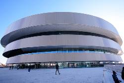 The ice rink is in place and most of the seating, but there is still an abundance of plastic sheeting, while some areas such as the locker rooms are far from finished.