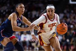 USC's only sustained run of the game ended the third quarter, with the Trojans outscoring UConn 18-9 to trail 69-39. Jana El Alfy's basket gave the Huskies their largest lead of 39 points earlier in the period.