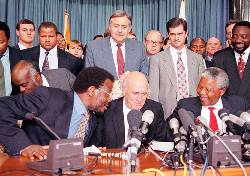 Meyer was minister of defense from 1991 to 1992 under the white minority government of former President F.W. De Klerk’s National Party. He later was a chief negotiator in the negotiations that brought an end to apartheid and led to the election of Nelson Mandela as the country’s first Black and democratically elected leader in 1994. Meyer served in Mandela’s cabinet as constitutional development minister from 1994 to 1996.