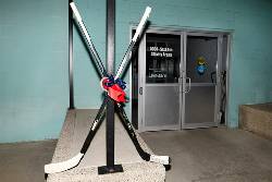 At the town’s arena, three white and red jerseys with the last names of the players were draped over a table, along with three upright hockey sticks.
