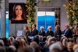 “Although she will not be able to reach this ceremony and today's events, we are profoundly happy to confirm that she is safe, and that she will be with us here in Oslo,” he said to applause.