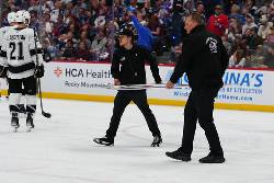 The Avalanche cleanup crew brought out shovels and buckets to clean up the fragments from the LA bench. The Kings players mingled on the ice as they waited for a new pane to be brought in and installed.