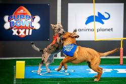 The Puppy Bowl made its debut as counter-programming to the Super Bowl in 2005. Dogs score touchdowns on a gridiron carpet when they cross the goal line — any goal line — with a toy in their mouth.